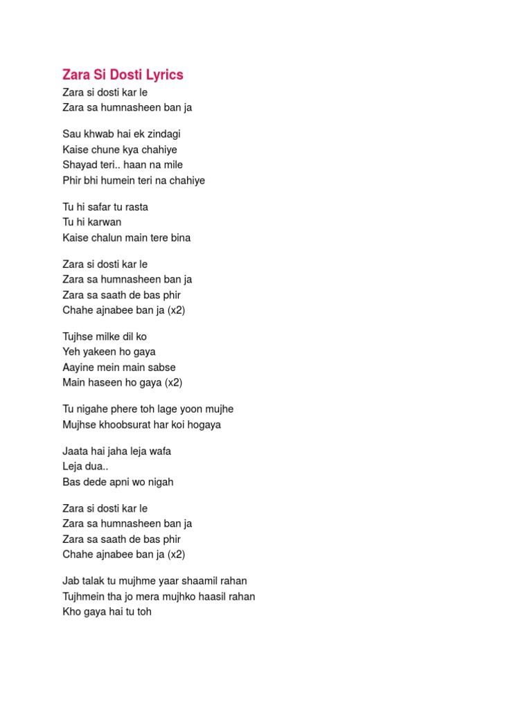 . Zara Zara Lyrics Rehnaa Hai Terre Dil Mein 2001 Bombay Jayashri Lyricsbogie Zara Si Dosti Lyrics Zara Sa Pani Khuda E Sukhan Mir Babar Ali Anee Lyrics Jawad Jafri