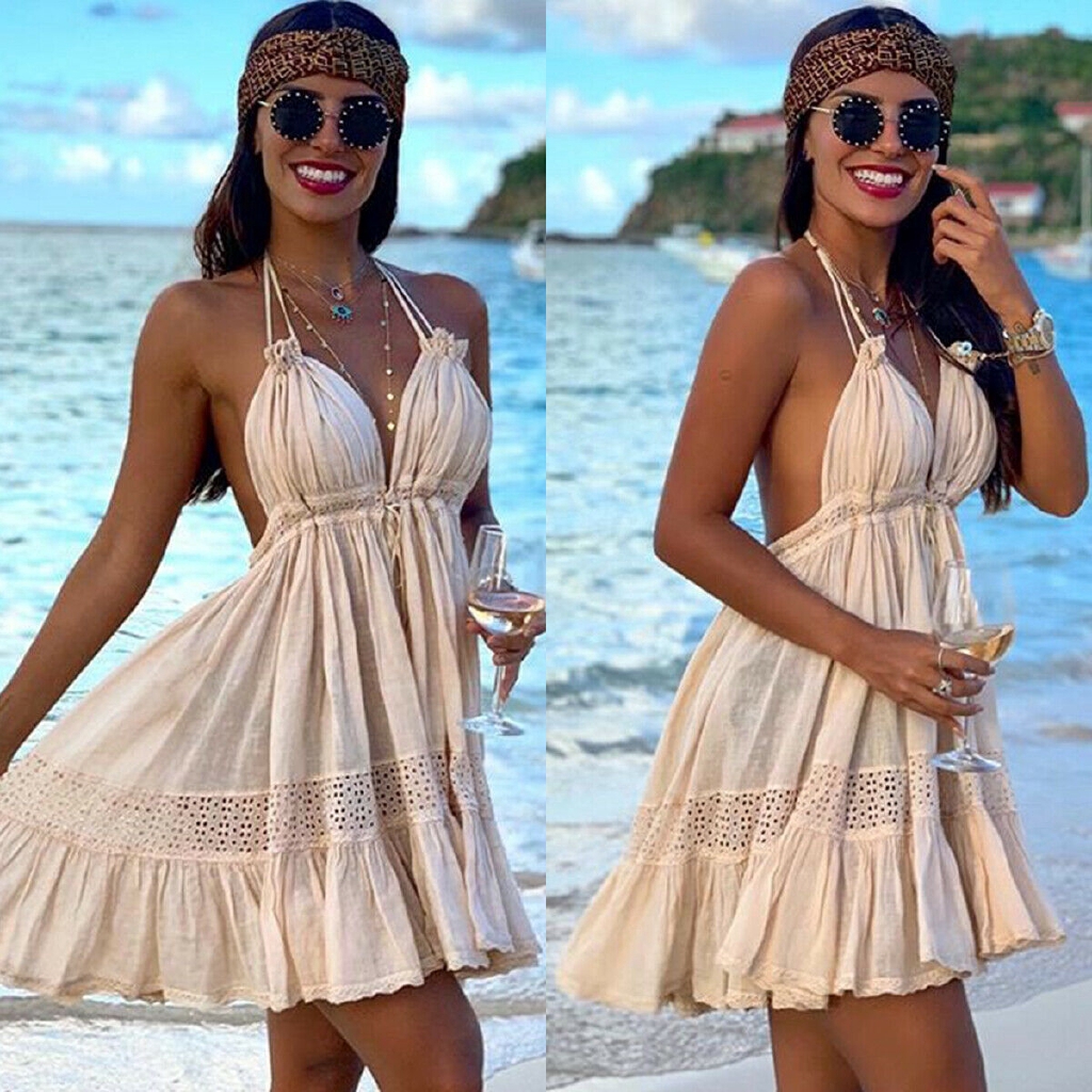 Women Boho Halter V Neck Solid Mini Dress Summer Sleeveless Party Beach Backless Casual Shopee Philippines